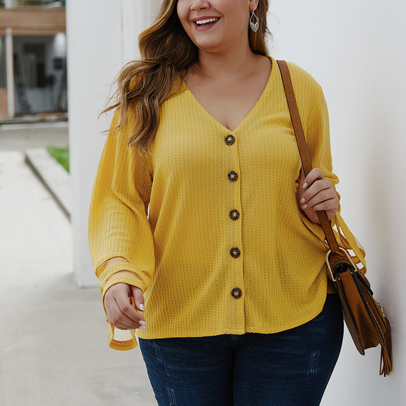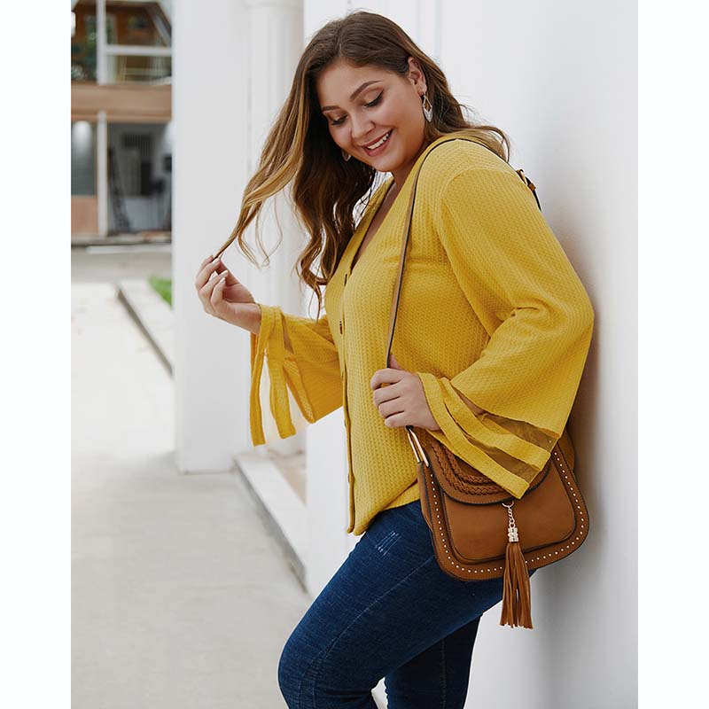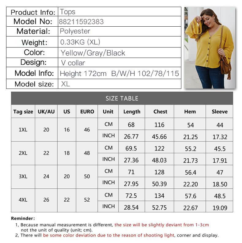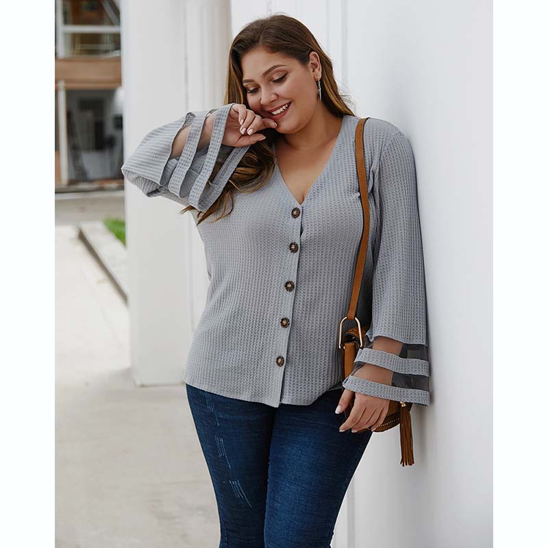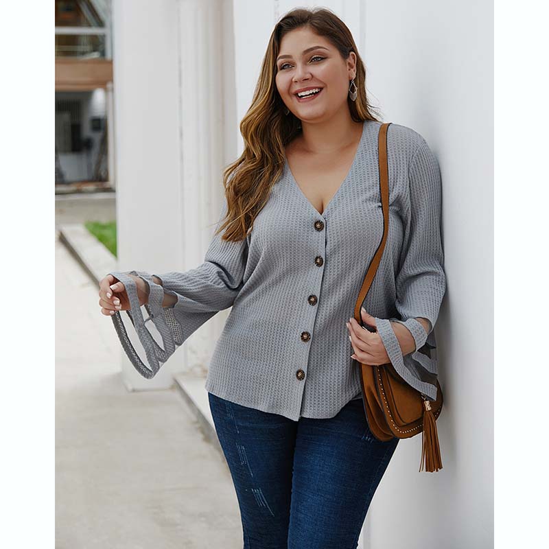 • Bell Sleeve V Neck Tops Plus Size 88211592383#