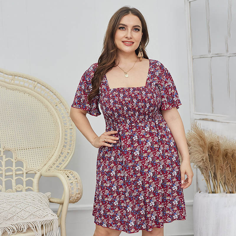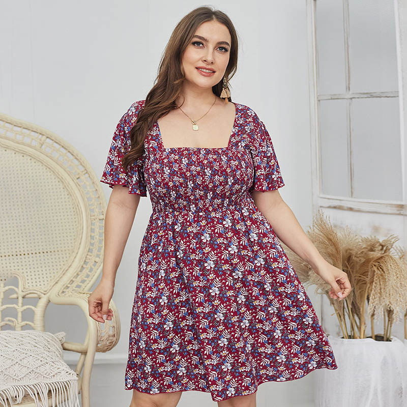 Ditsy Floral Shirred Bodice Square Neck A-Line Summer Dress 88211592121#