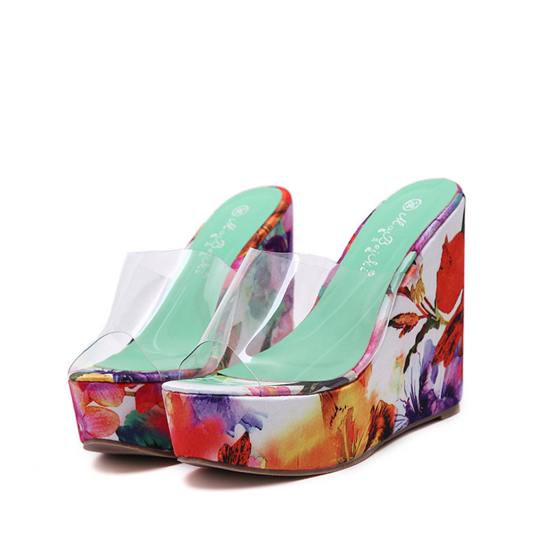 Floral Print Open Toe Slip On Platform Wedge Sandal #88211592251