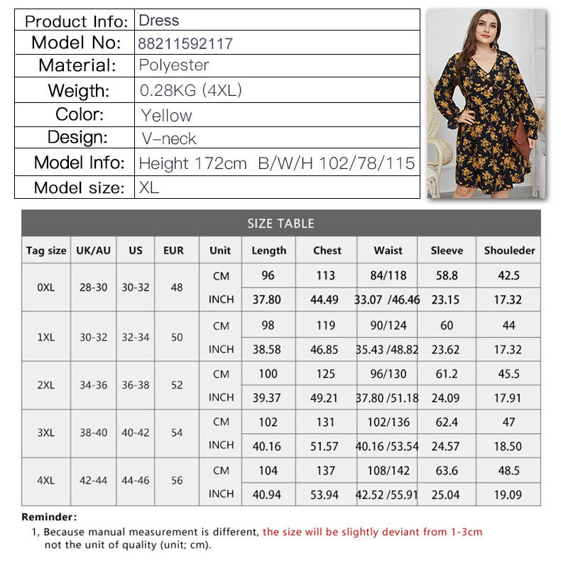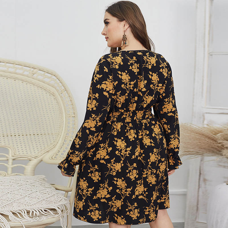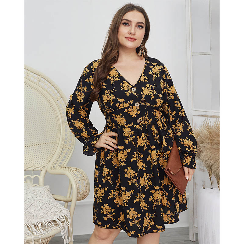 • Plus Button Front Floral Print V Neck A-Line Dress 88211592117#