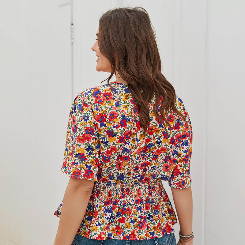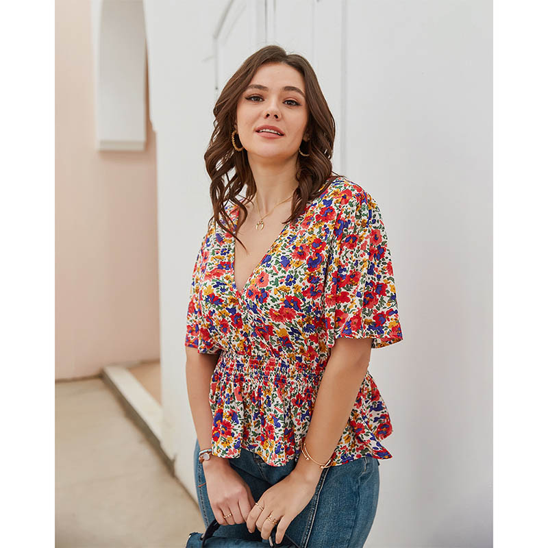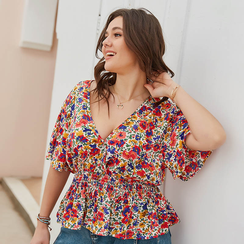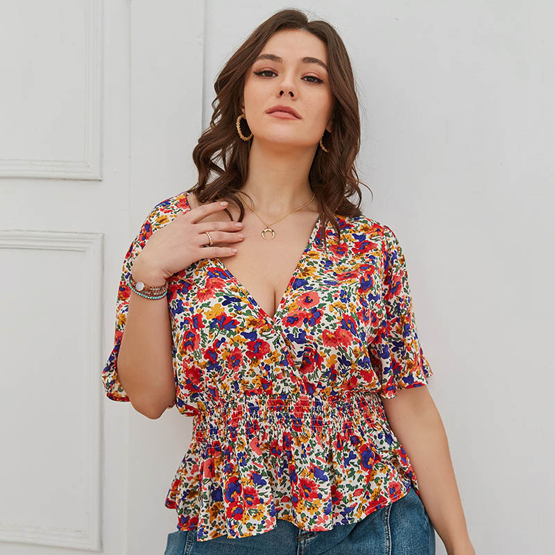 • Plus Floral Print Surplice Neck Shirred Waist Blouse 88211592122#