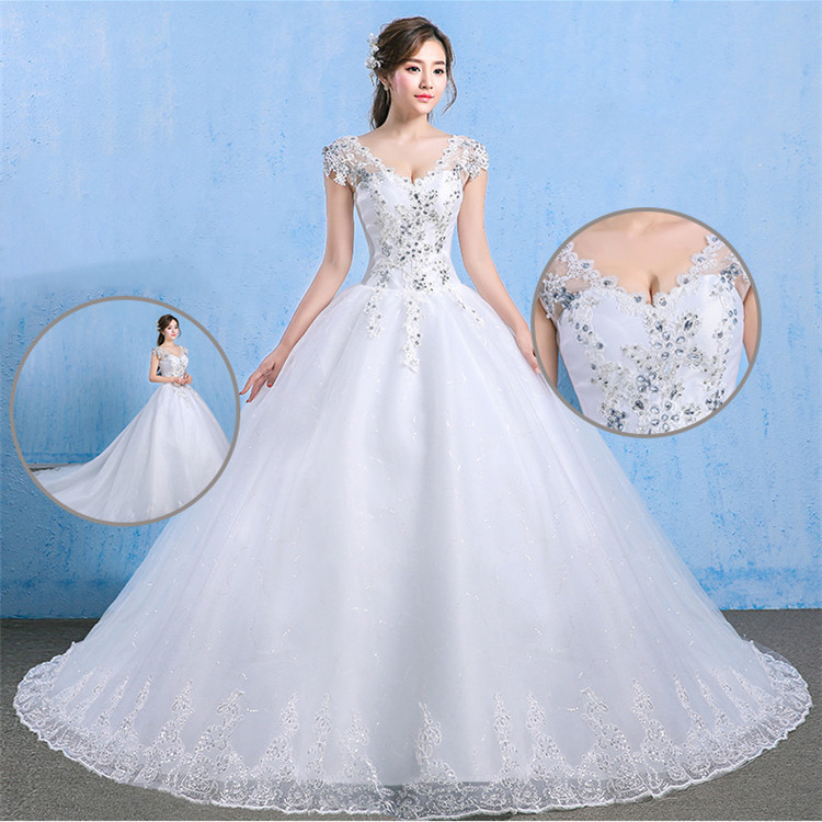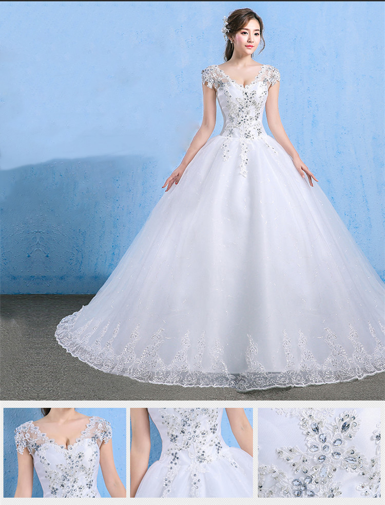 • Plus Size V Neck Beads Ball Gown Empire Wedding Dress Sweep Train Lace-up Back Maternity Dress 8433995875#