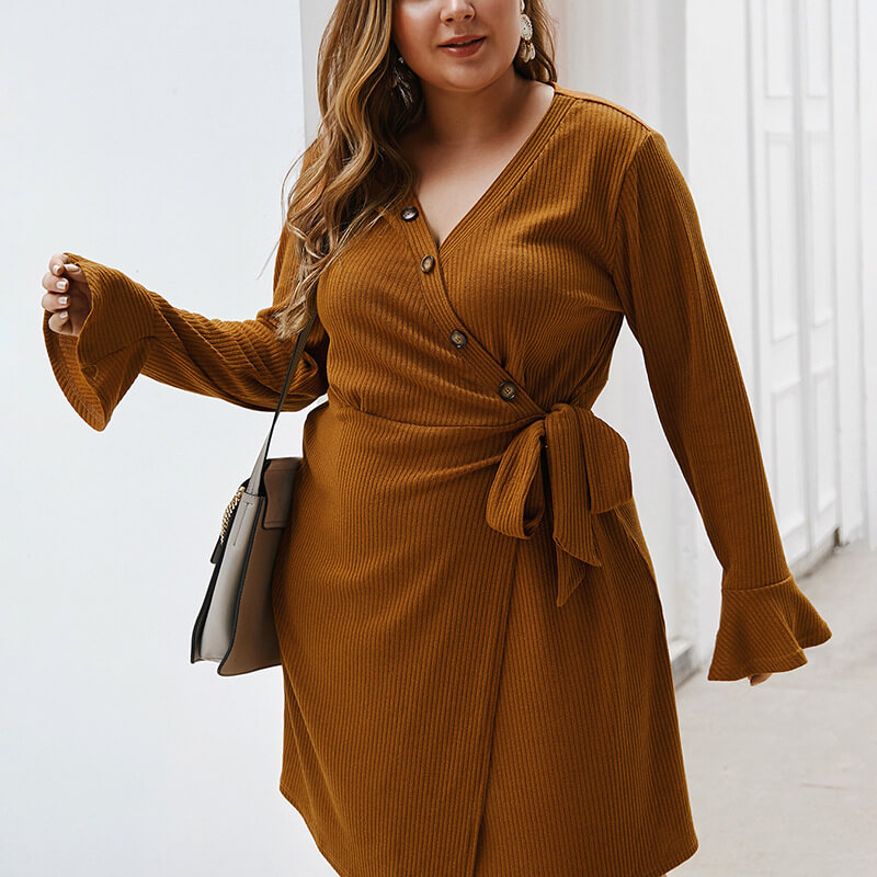 Solid V Neck Tie Wrap Dress Plus Size 88211592432#