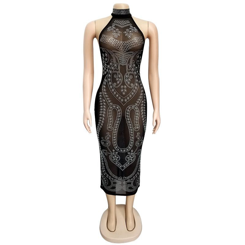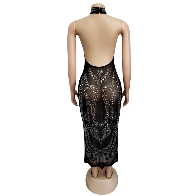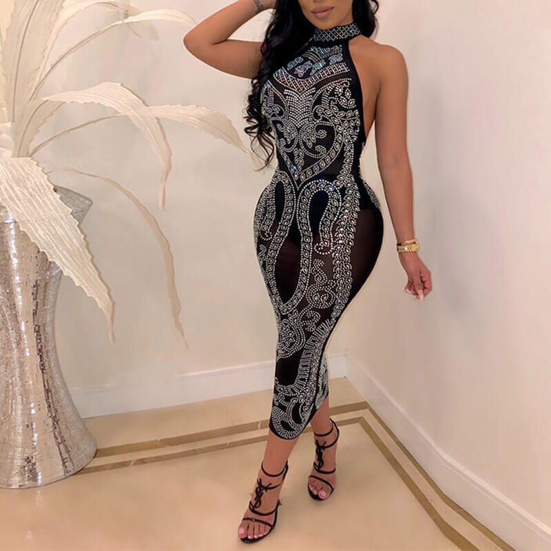 Sparkling Black Midi Bodycon Backless Dress 88211592325#