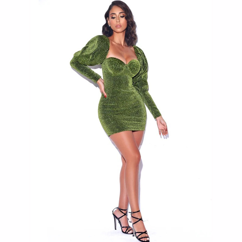 Sparkling Green Puff Sleeve Mini Bodycon Dress 88211592294#