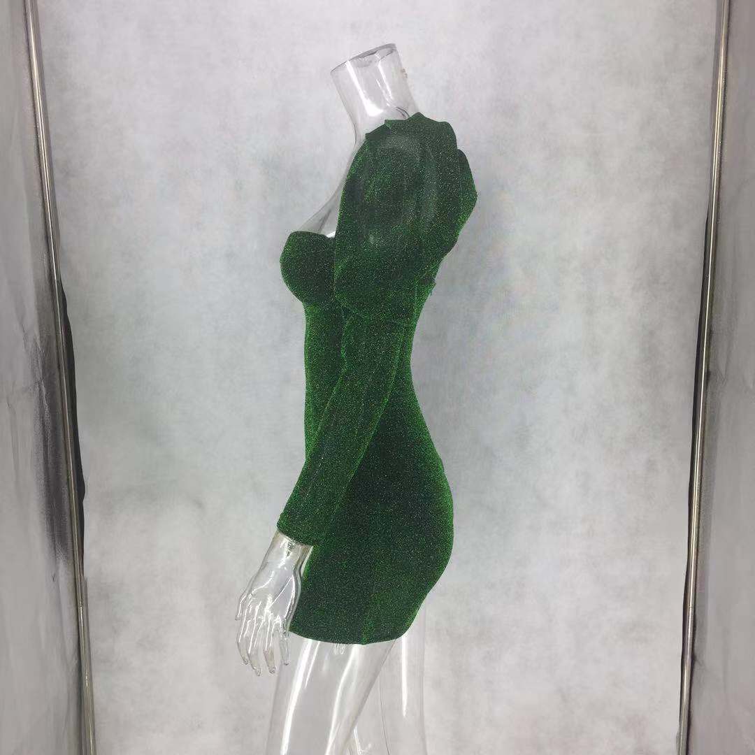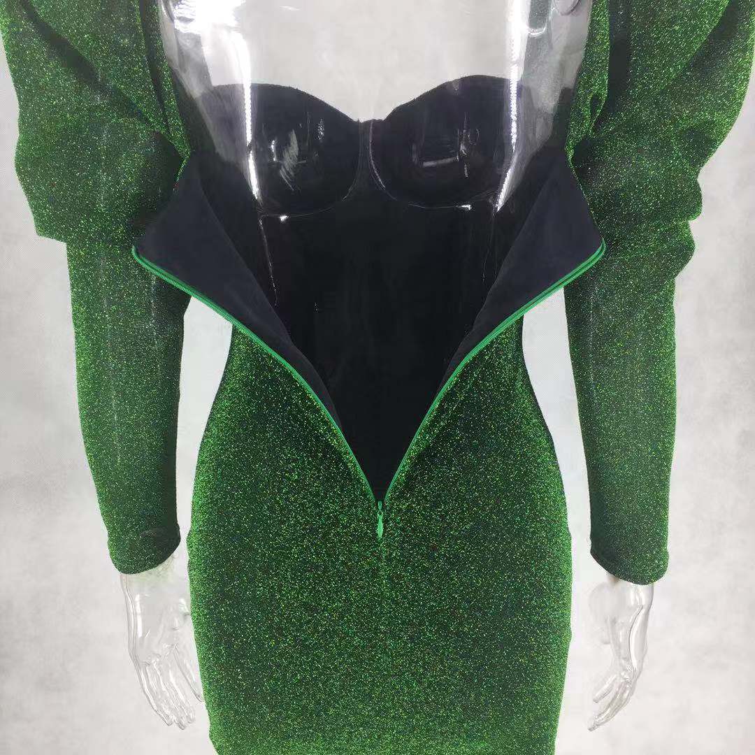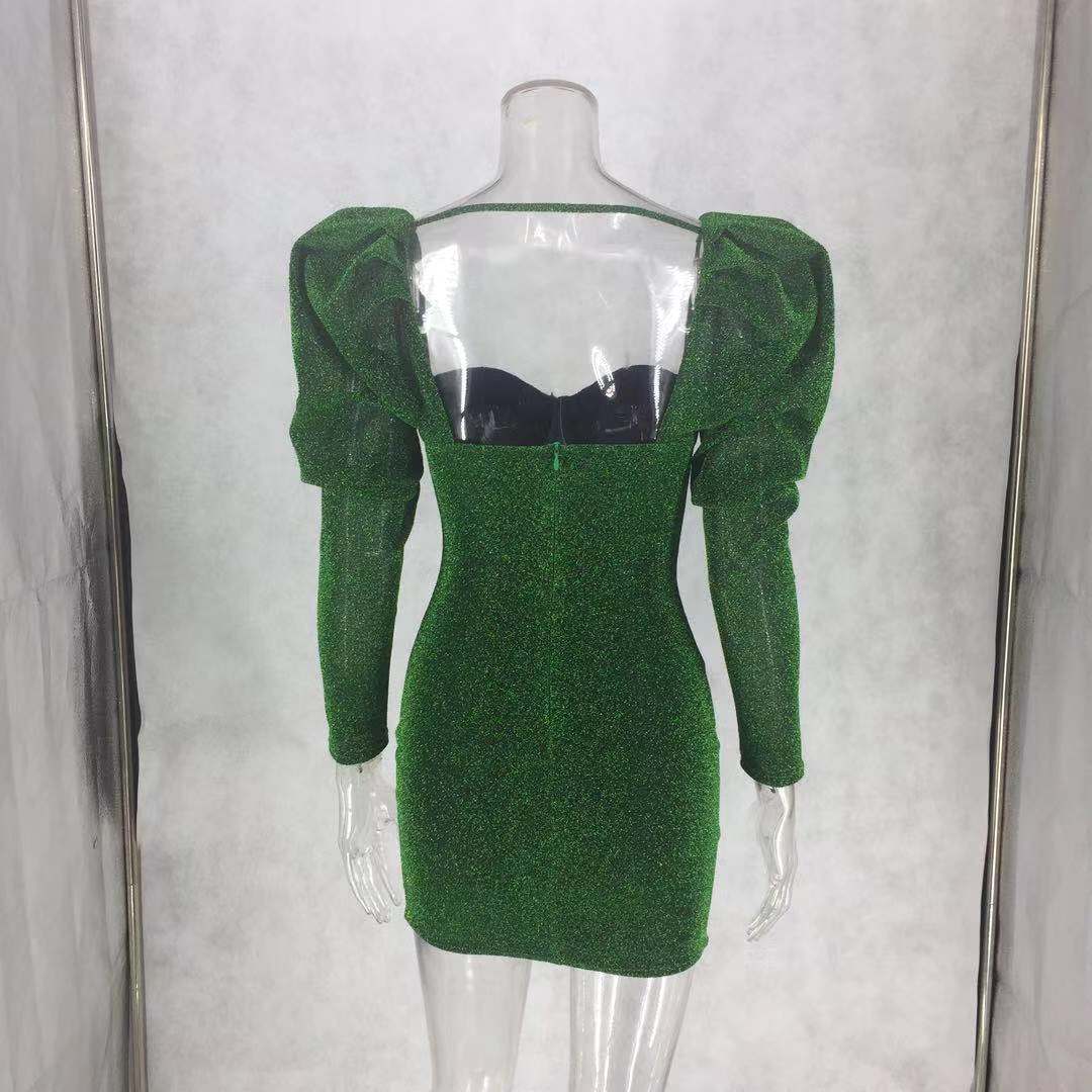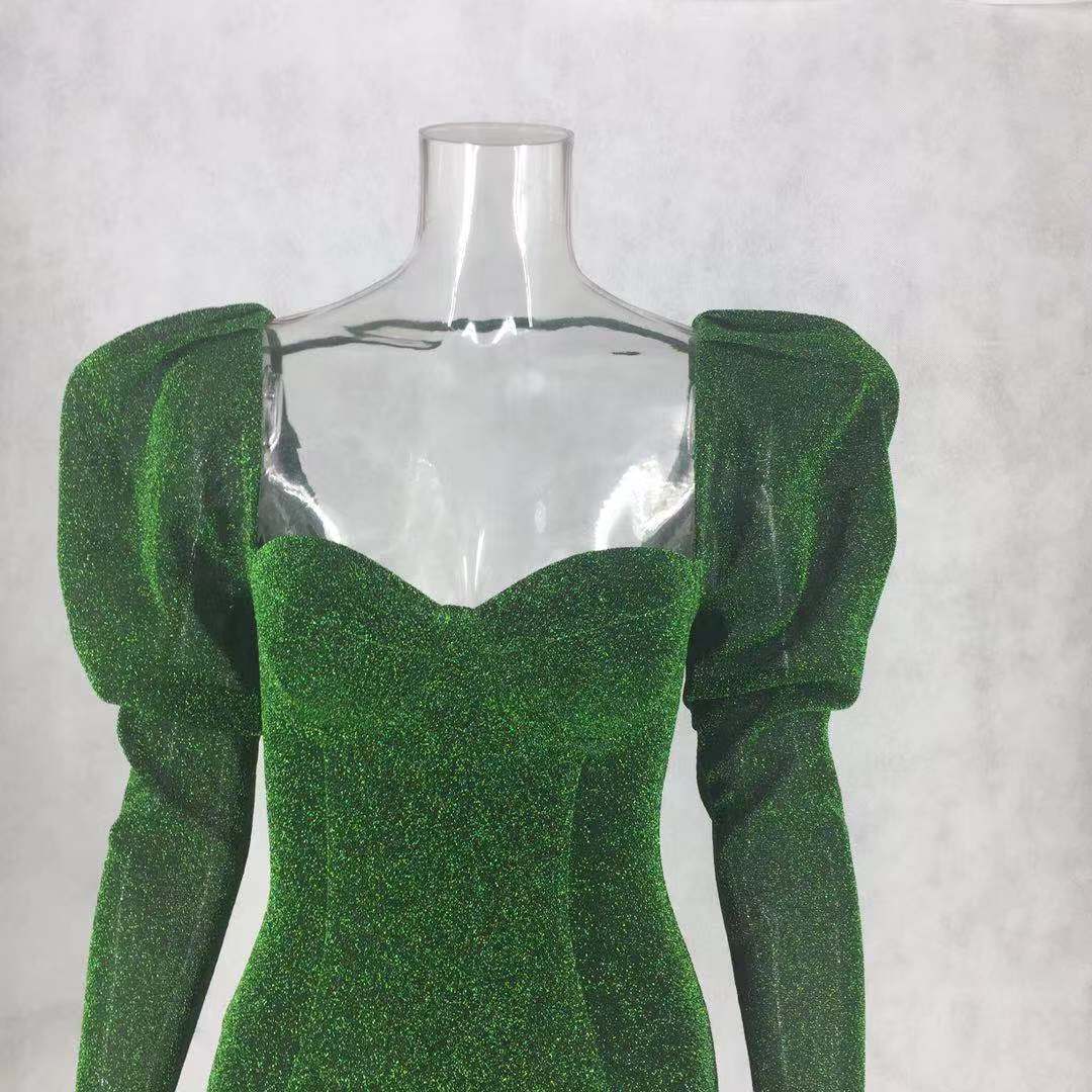• Sparkling Green Puff Sleeve Mini Bodycon Dress 88211592294#