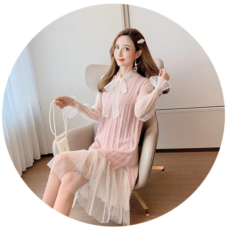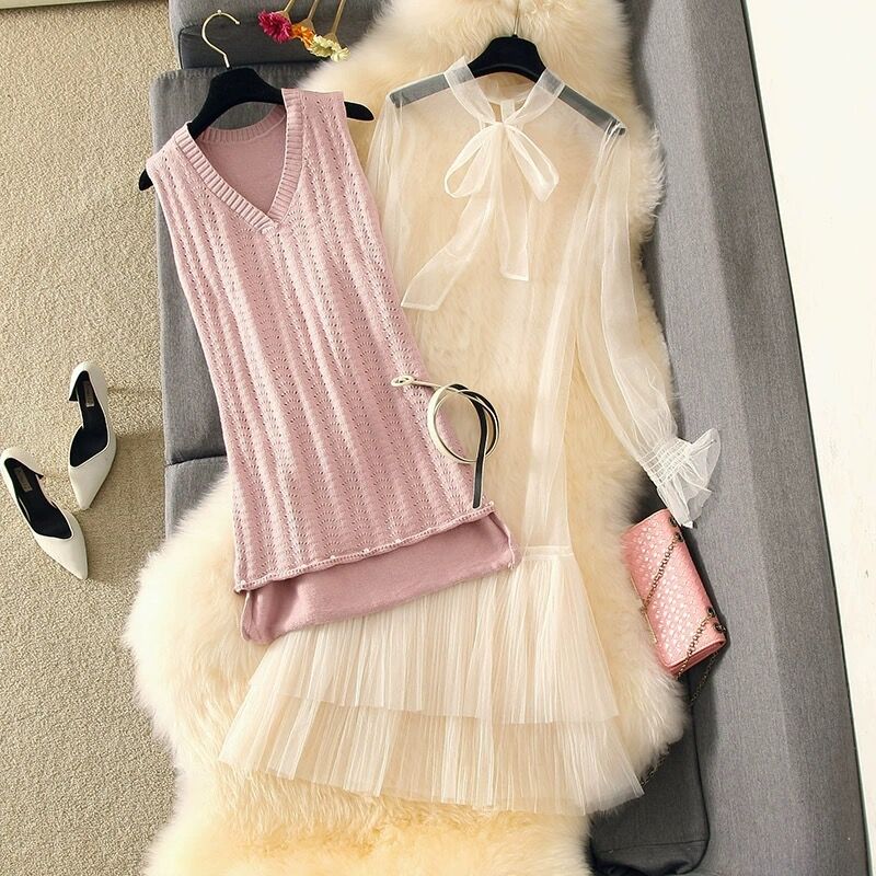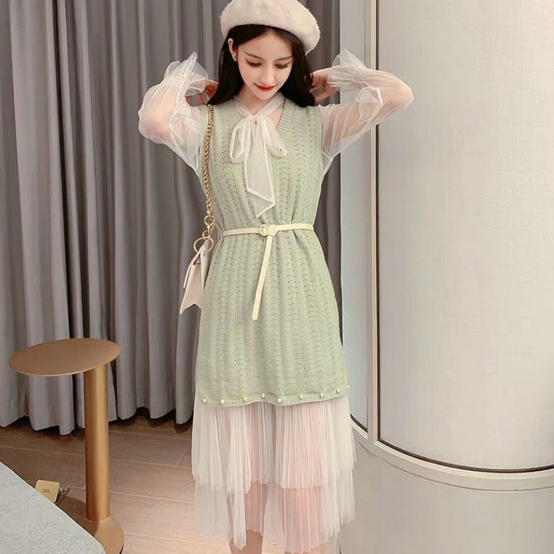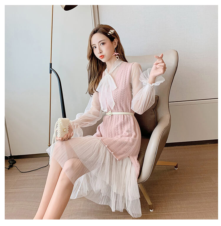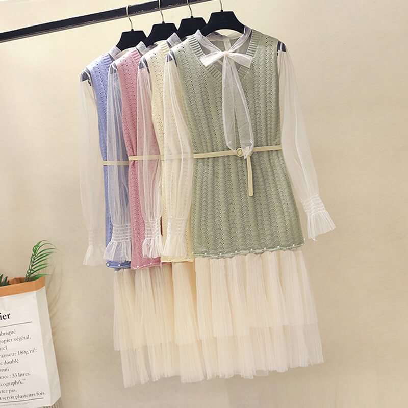 • Spring Autumn Women's V Neck Sweater with Tulle Long Dress Real 2pcs 8395238899#