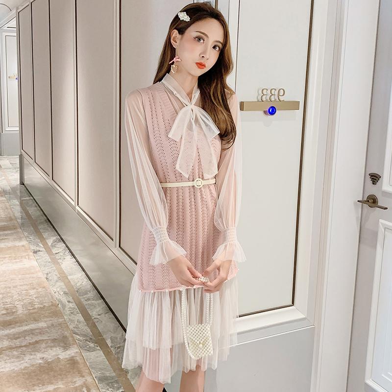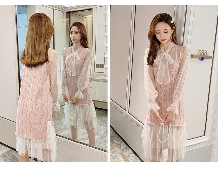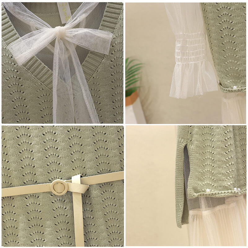 Spring Autumn Women's V Neck Sweater with Tulle Long Dress Real 2pcs 8395238899#