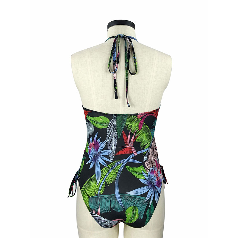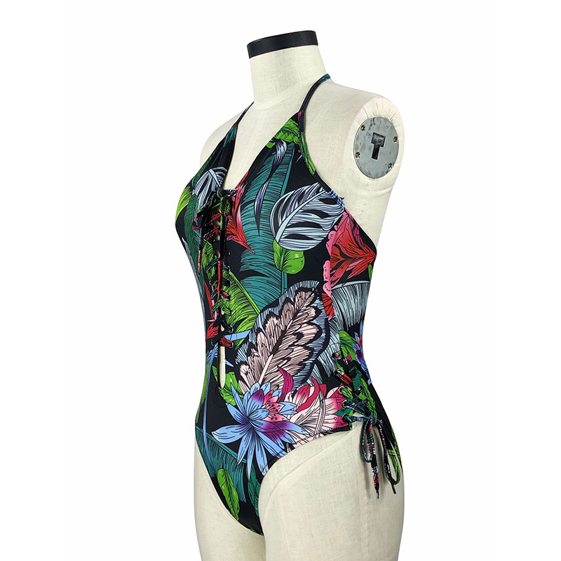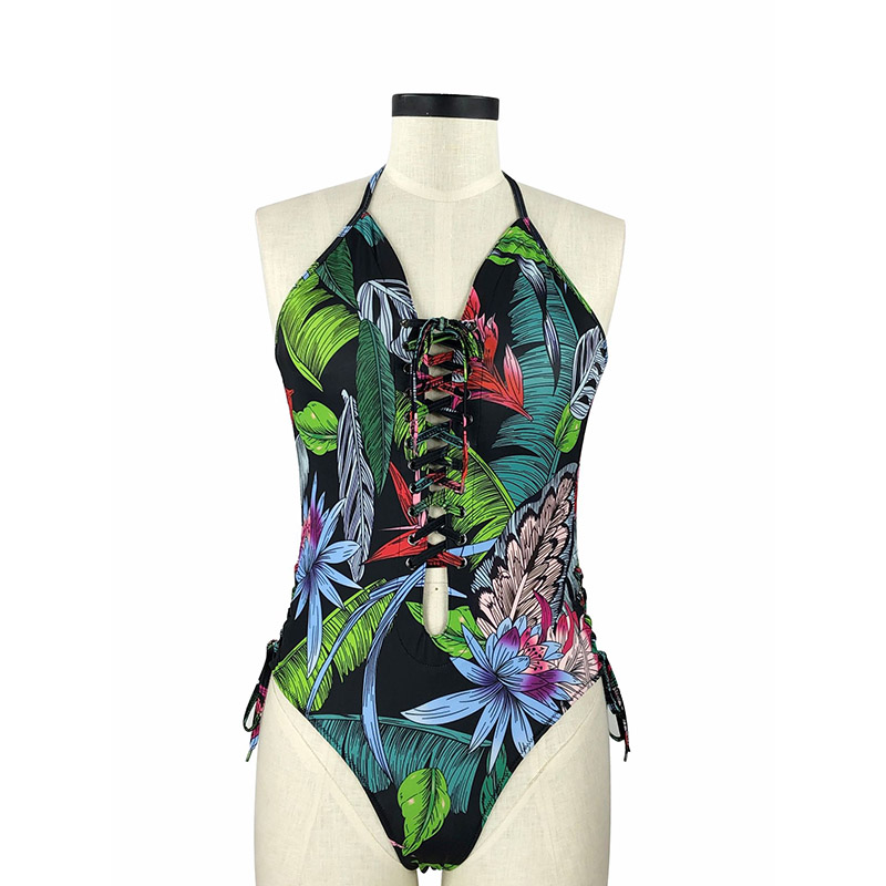 Tropical Print Lace Up One-Piece Swimsuit 88211592540#